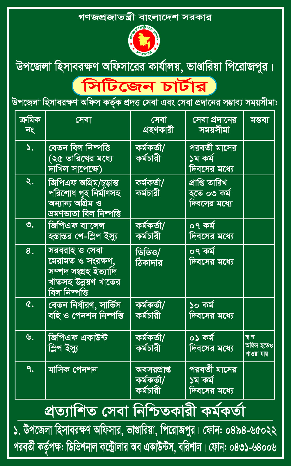 উপজেলা হিসাব রক্ষণ অফিসের সিটিজেন চার্টারঃ-